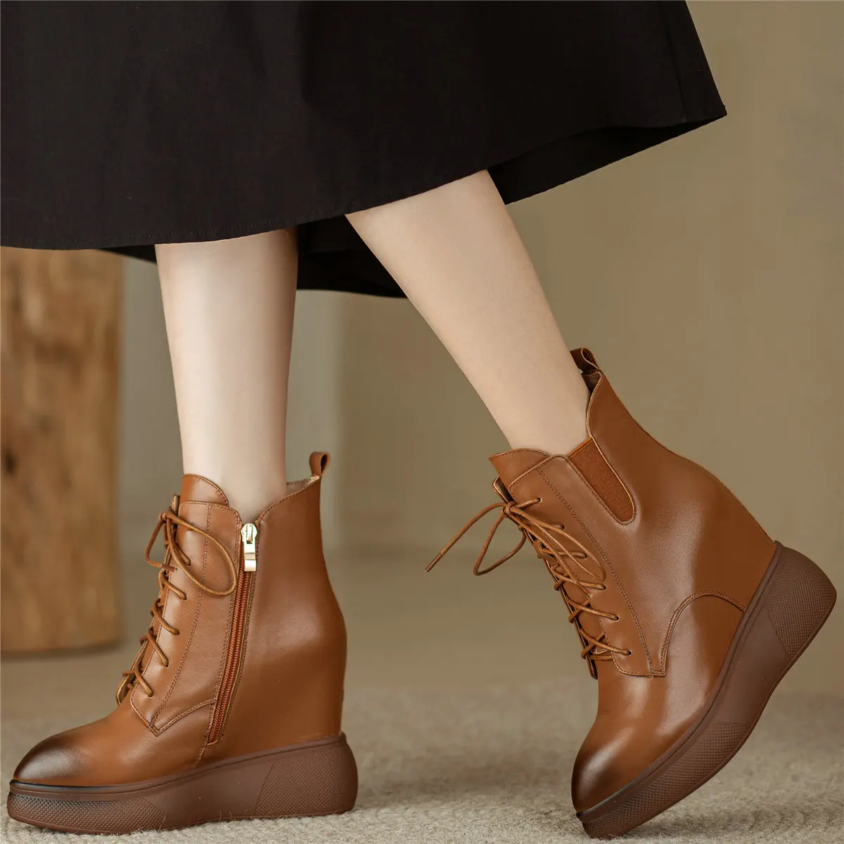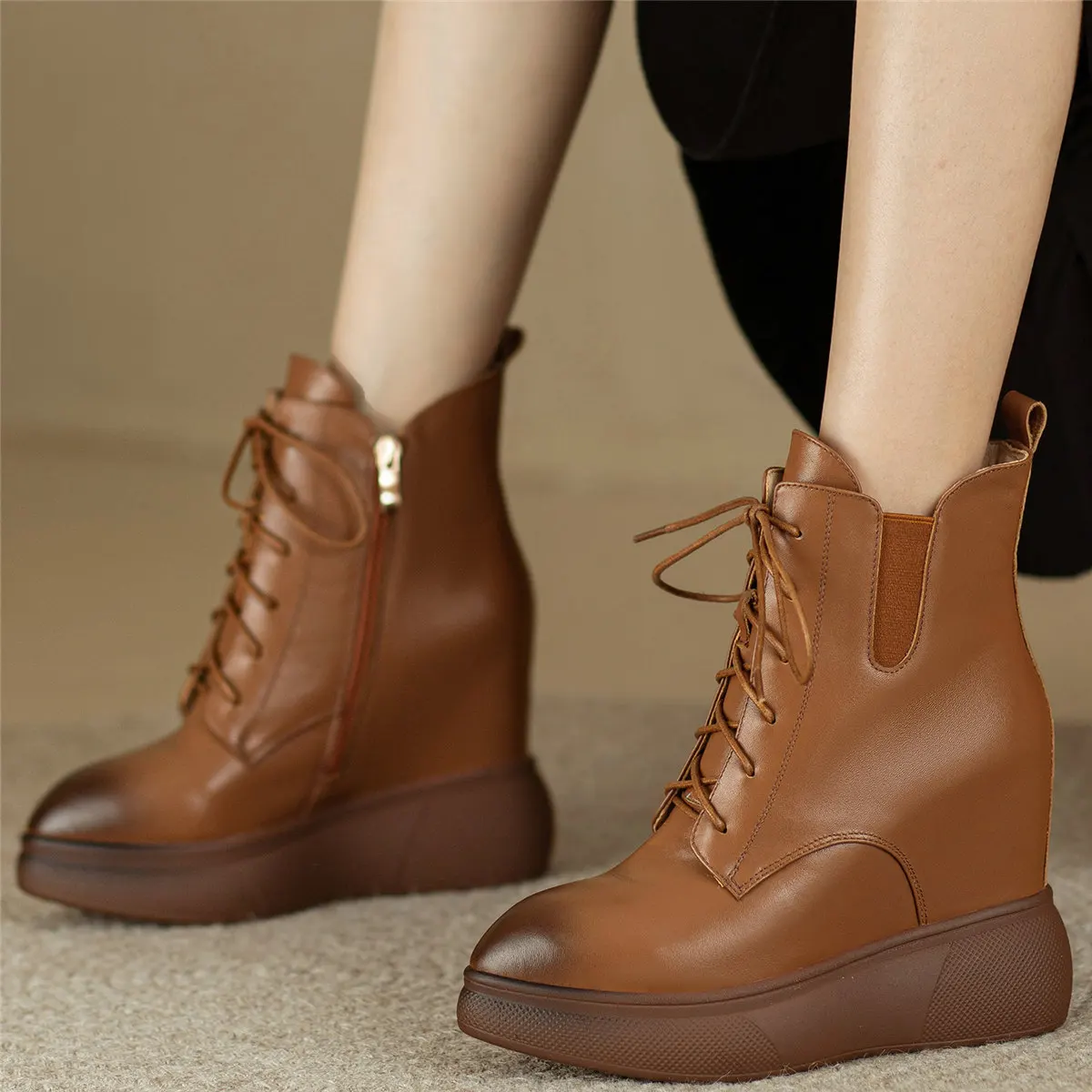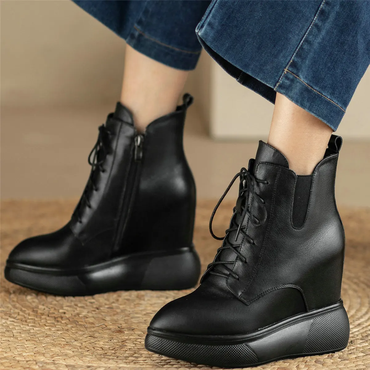 Platform Pumps Shoes Women Lace Up Genuine Leather Wedges High Heel Snow Boots Winter Pointed Toe Chunky Sneakers Casual Shoes