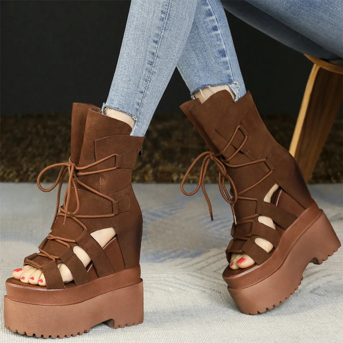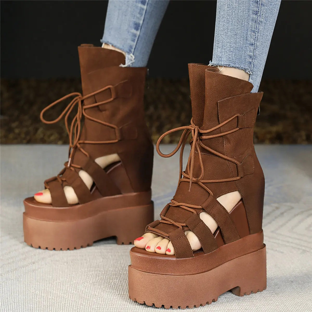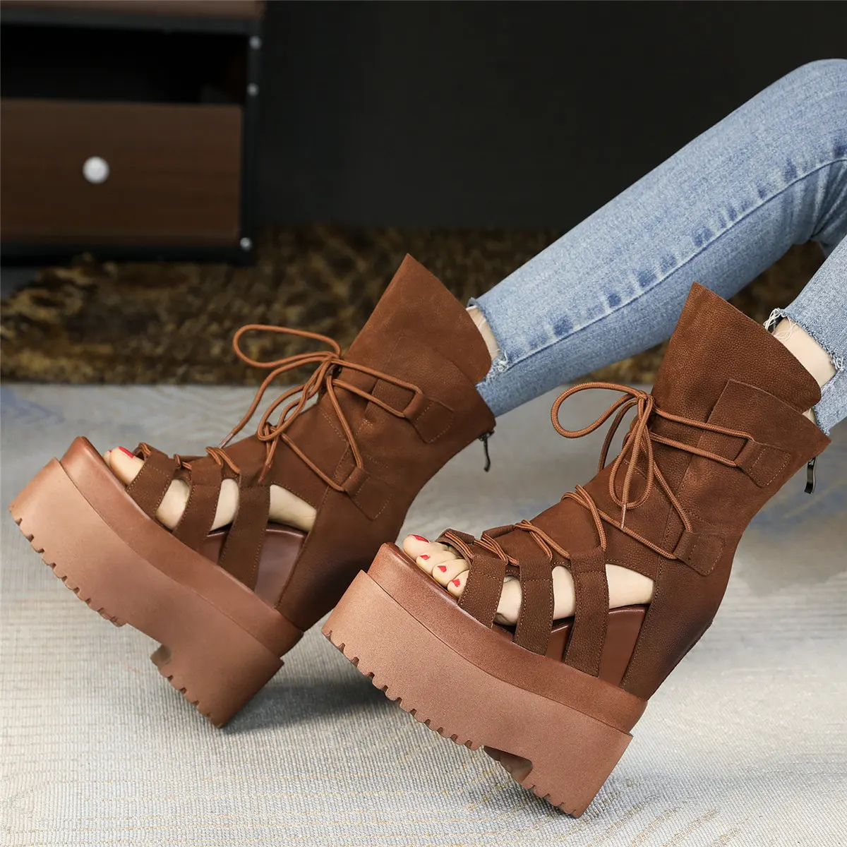 Summer Wedges Chunky Sneakers Women Lace Up Genuine Leather High Heel Gladiator Sandals Open Toe Platform Pumps Casual Shoes