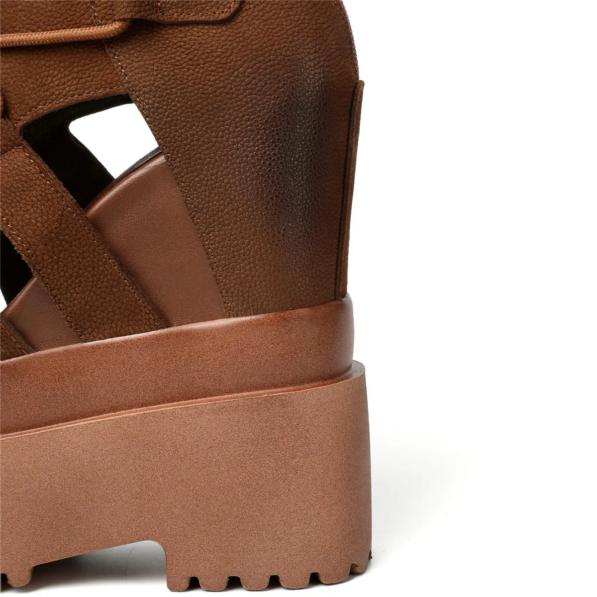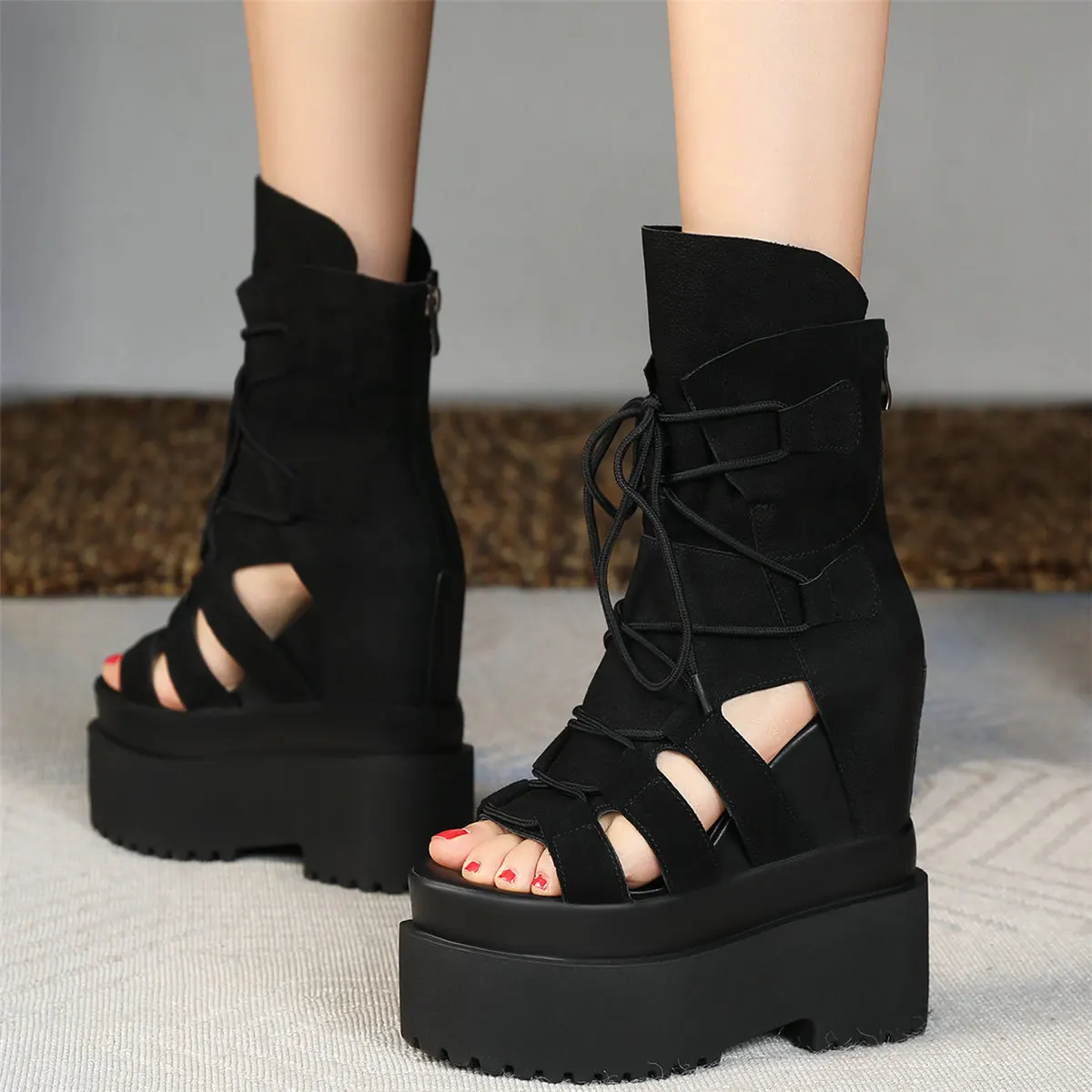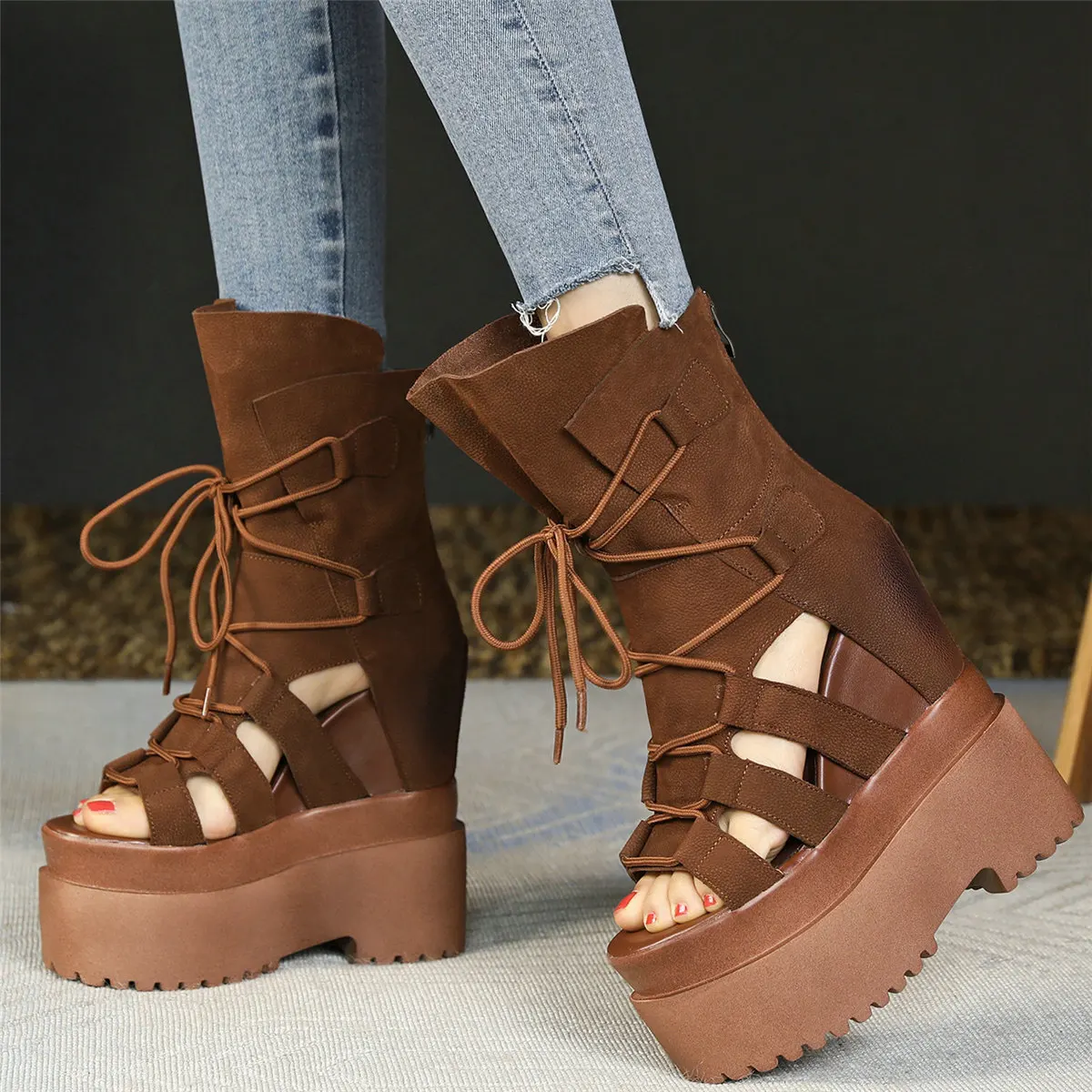 Summer Wedges Chunky Sneakers Women Lace Up Genuine Leather High Heel Gladiator Sandals Open Toe Platform Pumps Casual Shoes