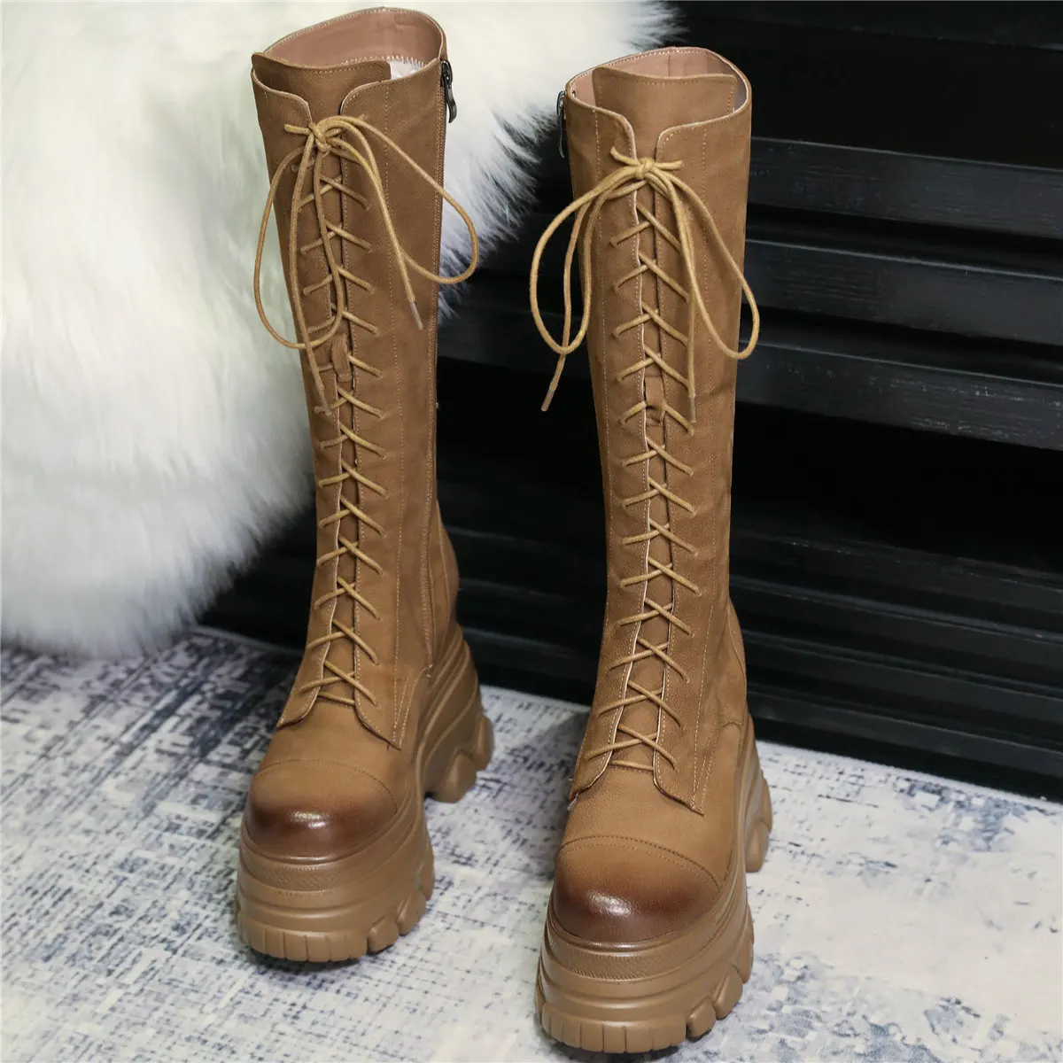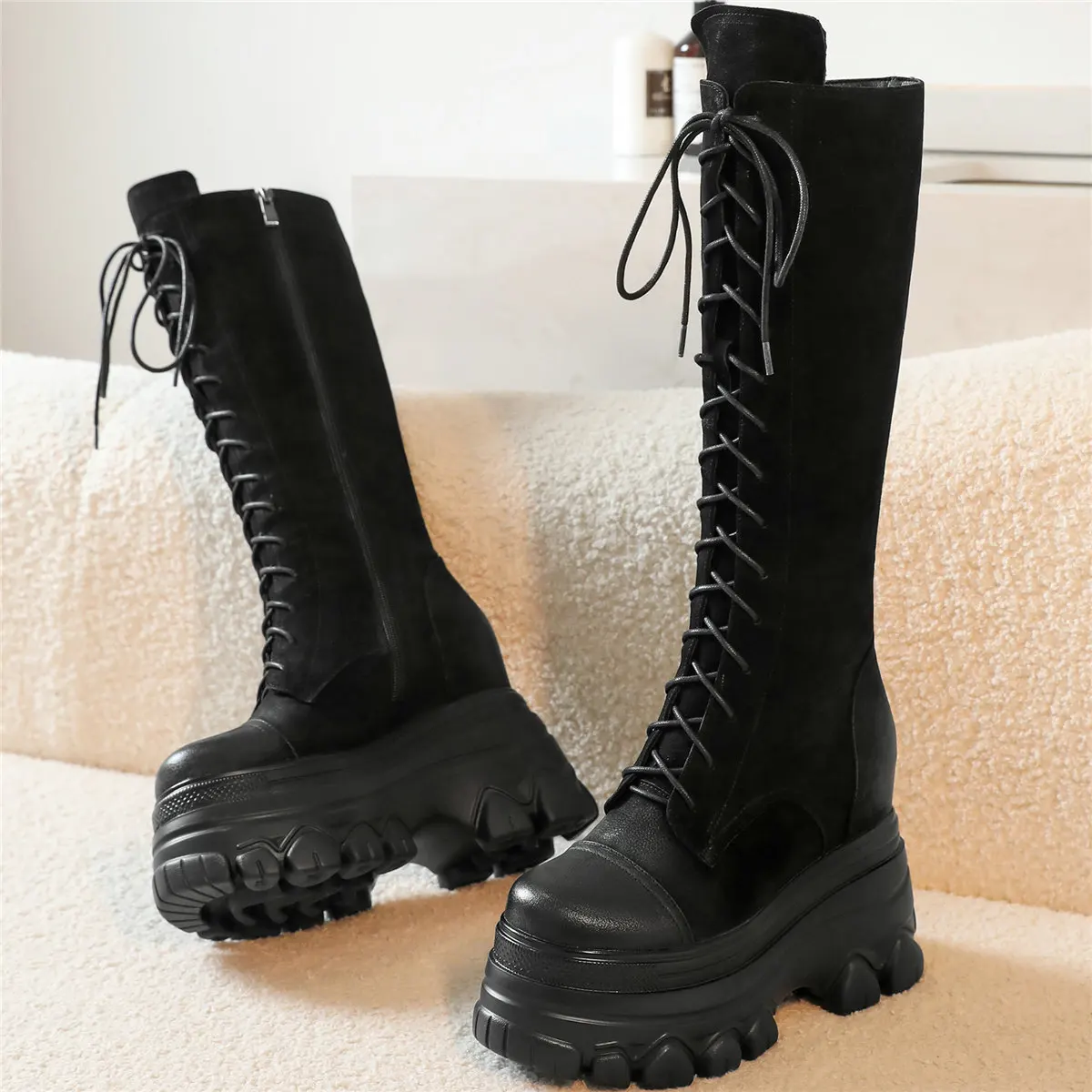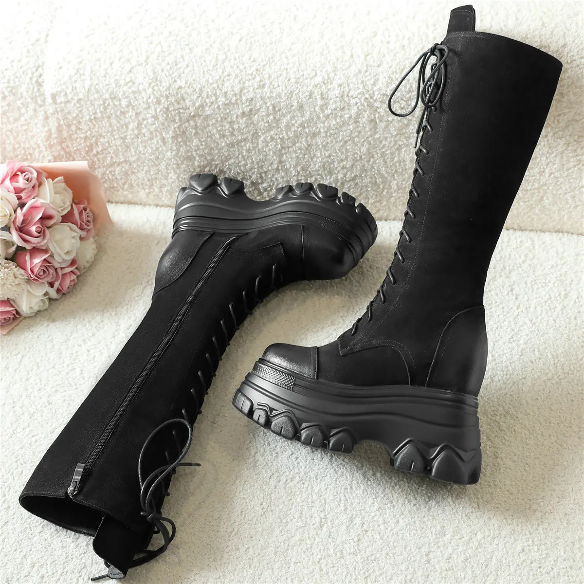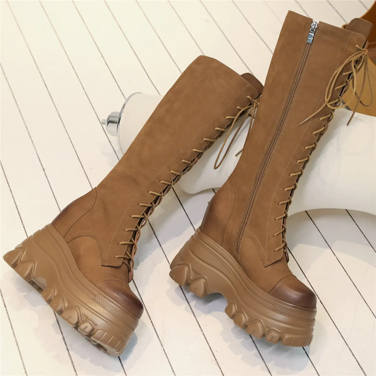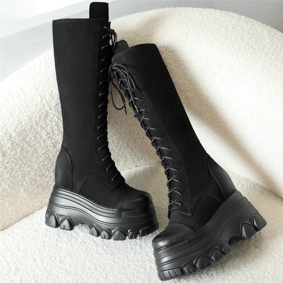 Winter Wedges Pumps Shoes Women Genuine Leather Super High Heels Knee High Snow Boots Round Toe Chunky Sneakers Casual Shoes